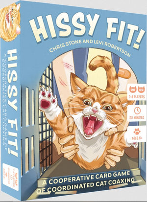 In this cooperative card game of carefully-coordinated cat coaxing, the humans are trying to get the cat into the carrier. But be careful, or this trip to the vet could turn into a trip to the emergency room! To win, you must guide the cat along the path and into the carrier by using treats, distractions and strategies from the Human Cards. Plan your actions, dress your wounds, and build combos to thwart the cat's defenses and steadily lead it into the carrier before time runs out. But each turn, Cat Cards are drawn to make the cat run, hide, scratch, or have a total conniption! If the cat has three full-blown "Hissy Fits" or you suffer too many scratches, the cat wins.