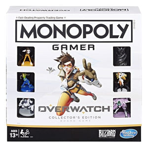 It's the Monopoly game for fans of Blizzard’s Overwatch! In the board game, each player drafts a team of 3, including a group leader, and then everyone battles for the high score to win! Players earn points by moving around the board capturing objectives and collecting Loot Boxes. The Monopoly Overwatch Collector's Edition includes a game board, 6 character tokens, 6 group leader cards, 16 objective cards, 9 Loot Box cards, 4 reminder cards, 1 numbered die, 1 ability die, 90 plastic HP chips (50 fives and 40 ones), a premium box, and a Game Guide.