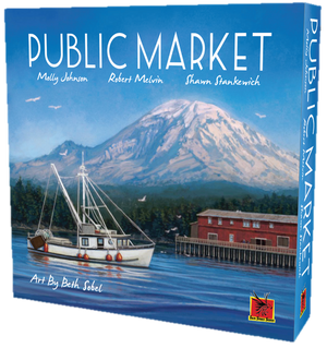 Public Market is a tile laying game for 1 to 5 players. Players will bid for turn order and then take one of two actions. Players will either go fishing or will go