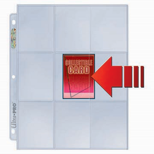 9-Pocket Page with side-loading pockets help prevent cards from easily falling out of the binder. Archival quality pages are ideal for trading card games, collectible cards and artist cards. Clear middle material gives allows the collection to be sorted with single-sided cards. Pages are designed to fit in our standard-size 3-ring albums.